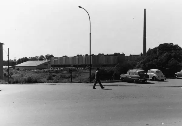 J. L. Tiedemanns Tobaksfabrik på Hovin i 1968. Fotografiet ble tatt i forbindelse med konstruksjonen av fabrikken og viser en man som går på en gate med den nye fabrikken i bakgrunnen.