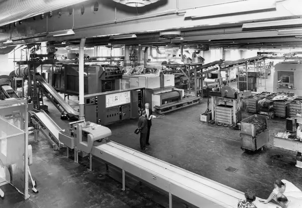 J. L. Tiedemanns Tobaksfabrik på Hovin i 1968. Interiørbilde fra produksjonsområdet i den nye fabrikken.