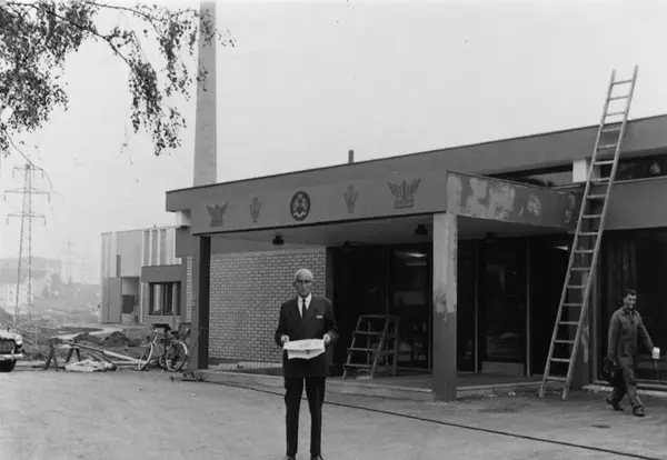 J. L. Tiedemanns Tobaksfabrik på Hovin i 1968. Fotografiet er tatt i forbindelse med konstruksjonen av fabrikken og viser en mann i dress og en bygningsarbeidere foran inngangen til fabrikken.
