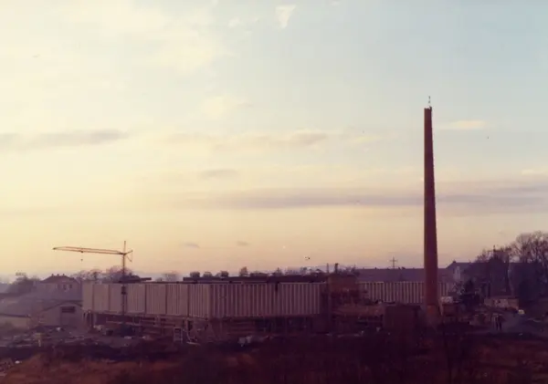 Byggeplass. Konstruksjon av J. L. Tiedemanns Tobaksfabrik på Hovin i 1968.