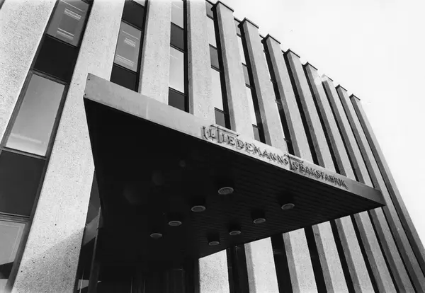 Eksteriørbilde av inngangen på J. L. Tiedemanns Tobaksfabrik på Hovin.