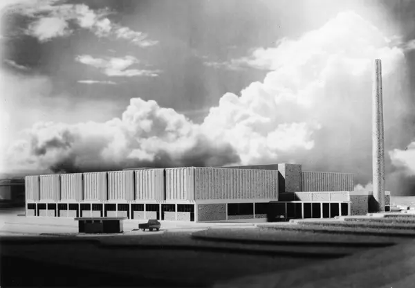 Modell av J. L. Tiedemanns Tobaksfabriks nye anlegg på Hovin. Foto fra album med bilder fra innvielsen av fabrikken i 1969.