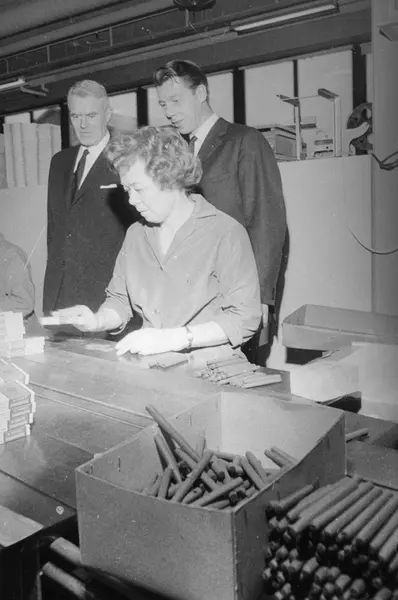 Fabrikkeier Johan Henrik Andresen og ansatte ved pakkingen av sigarillos på Tiedemanns nye fabrikk på Hovin i 1968.