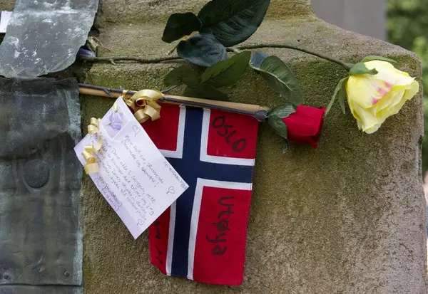 "Sorg i det offentlige rom". Roser, flagg og håndskrevet kort ved Oslo Domkirke 22.08.2011, en måned etter terrorhandlingene i Oslo og på Utøya.