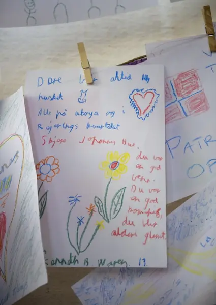 "Sorg i det offentlige rom". Barnetegninger inne i Oslo Domkirke 22.08.2011, en måned etter terrorhandlingene i Oslo og på Utøya.