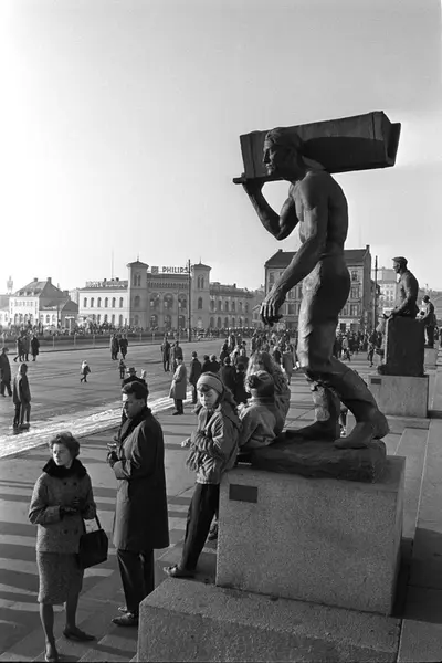 Publikum langs løypa på Rådhusplassen. Store skulpturer på plassen. Vestbanestasjonen i bakrunnen. Vikarennet i Oslo. Fotografert november 1965.
