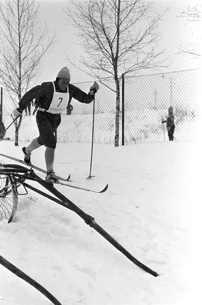 Skiløper Hallgeir Brenden med startnummer 7 på brystet, i fint driv forbi en parkert sulky på Bjerkebanen. Langrenn på Bjerke Travbane i regi av idrettslaget BUL i desember 1962.