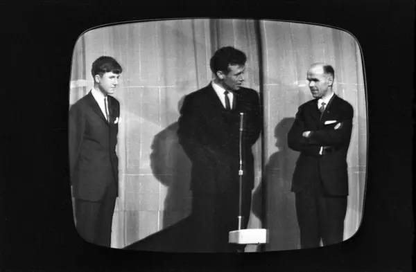 Fra NRKs fjernsynsprogram "Kvitt eller dobbelt" i oktober 1966. Programleder Knut Bjørnsen i midten sammen med to av deltakerne. Avfotografert fra fjernsynet.