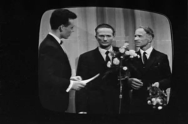 Fra NRKs fjernsynsprogram "Kvitt eller dobbelt" i desember 1966. Programleder Knut Bjørnsen sammen med to deltakere. Deltaker Per Lønning til høyre gikk opp i "1001 natt". Avfotografert fra fjernsynet.