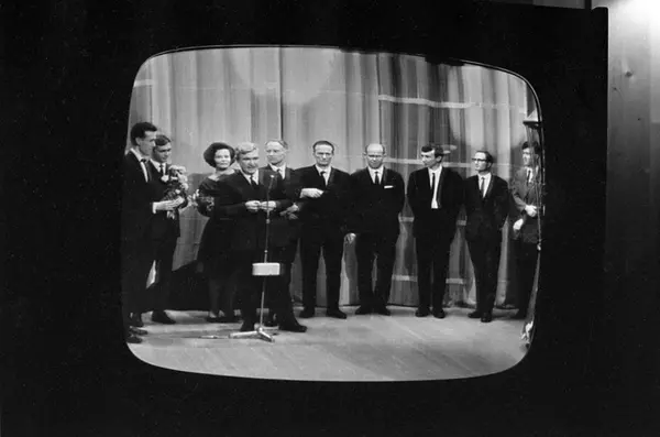 Fra NRKs fjernsynsprogram "Kvitt eller dobbelt" i desember 1966. Programleder Knut Bjørnsen til venstre sammen med flere deltakere. Deltaker Per Lønning, til høyre for den kvinnelige deltakeren, gikk opp i "1001 natt". Avfotografert fra fjernsynet.