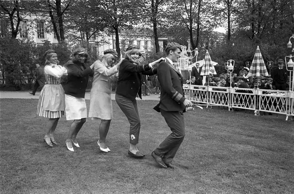 Russen danser jenka og viser russemoter på gressplenen utenfor uterestauranten Pernille i Oslo i mai 1965. Antatt russepresident og russeprinsesse danser først i rekka. Universitetet skimtes i bakgrunnen.