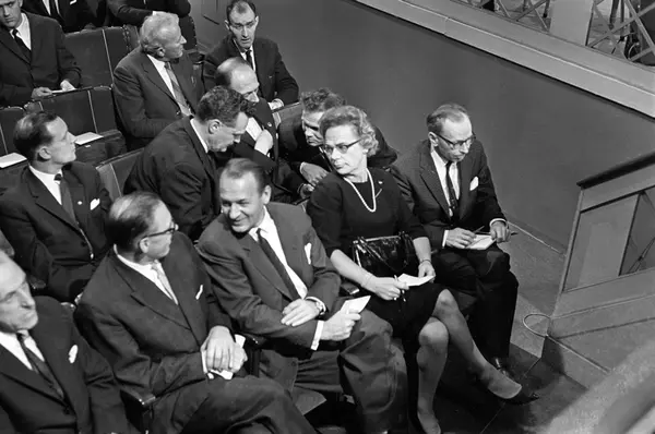 Publikum i salen under en TV-debatt om idrett i Centralteatret i november 1965. På første rad, nr. 2 fra høyre sitter Laila Schou Nilsen. På raden bak sitter Rolf Kirkvaag og snakker med Erling Stordahl ytterst til høyre.