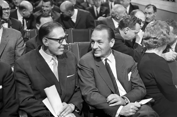 Publikum i salen under TV-debatt om idrett i Centralteatret i november 1965. Til høyre Laila Schou Nilsen med ryggen til. Bak på rad 2 Rolf Kirkvaag som snakker med Erling Stordahl ytterst til høyre.
