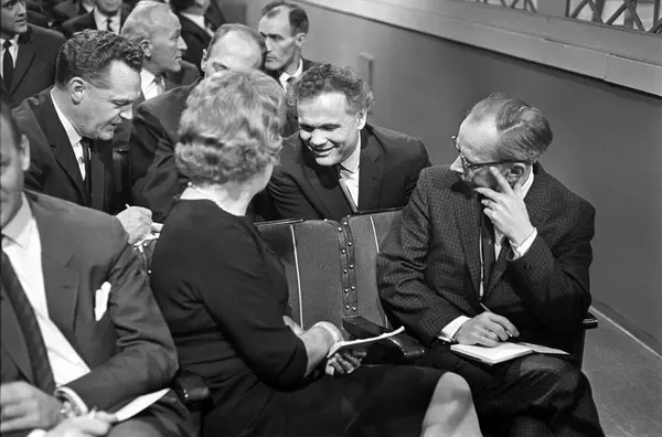 Publikum i salen under TV-debatt om idrett i Centralteatret i november 1965. Midt på bildet Laila Schou Nilsen med ryggen til. Bak på rad 2 Rolf Kirkvaag som snakker med Erling Stordahl ytterst til høyre.