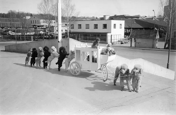 Pudler på rekke og rad står på to ben etter en liten vogn, karet, med valper. Sirkus Schumann viser ett av sirkusnumrene med pudler under sitt besøk på Sjølyst i Oslo i april 1965.
