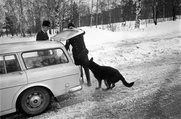 Politipatrulje med Schæferhund. Politiet ettersøker en voldsforbryter i skogsområdet rundt Brannfjell i februar 1961. Politibilen er en Volvo Amazon stasjonsvogn.