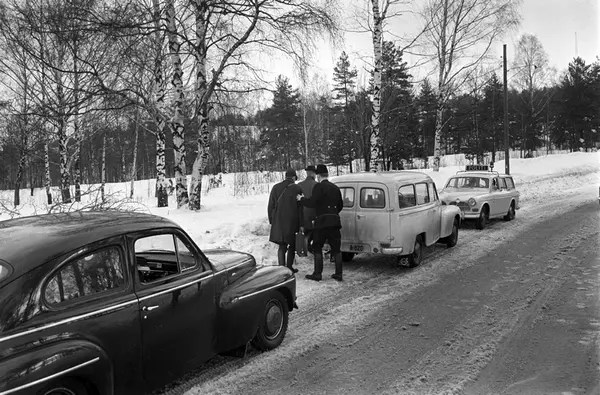Politietterforskere på åstedsbefaring. Politiet ettersøker en voldsforbryter i skogsområdet rundt Brannfjell i februar 1961. Politibilen til høyre er Volvo Amazon stasjonsvogn. Politibilen til venstre er en Volvo PV.