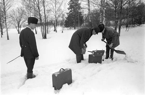 Politietterforskere på åstedsbefaring. Politiet ettersøker en voldsforbryter i skogsområdet rundt Brannfjell i februar 1961. Her tas det prøver i snøen.