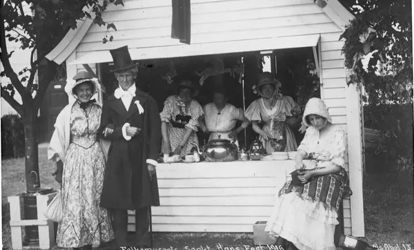 Postkort. Kvinner og en mann foran markedsbod med kaffekjeler. Norsk Folkemuseums St. Hansfest 1916.