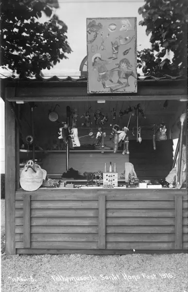 Postkort. Markedsbod med salg av leker. Norsk Folkemuseums St. Hansfest 1916.