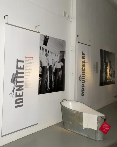 Utstillingsplakat og rekvisitter. På badekaret henger det en rød lapp med et sitat fra en tidligere skolehjemselev. Fra utstillingen om Bastøy skolehjem på Norsk Folkemuseum. Utstillingen stod i perioden 15.12.2010 til 31.12.2011.