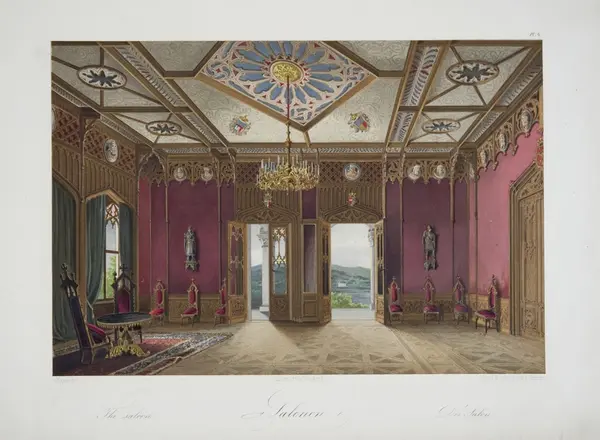 Oscarshall. Salongen. Litografi av von Hanno. Avfotografert plansje fra boken "Oscarshal" av Christian Holst og Christian Tønsberg, 1856.