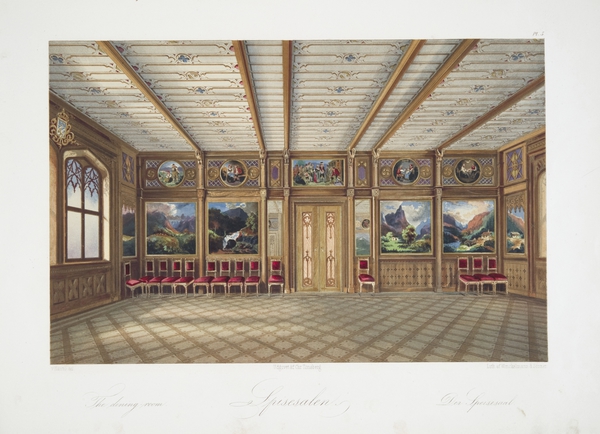 Oscarshall. Spisesalen. Litografi av von Hanno. Avfotografert plansje fra boken "Oscarshal" av Christian Holst og Christian Tønsberg, 1856.