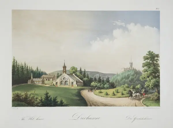 Drivhus, orangerie og gartnerbolig ved Oscarshall. Litografi av von Hanno. Avfotografert plansje fra boken "Oscarshal" av Christian Holst og Christian Tønsberg, 1856.