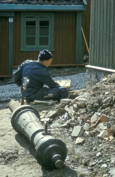 Vannposten fra Flisberget på Enerhaugen settes opp på Norsk Folkemuseum, 1971.