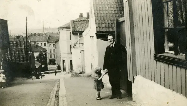 Albert Scheinpfug med datteren Erna foran porten til Johannes gate 4, Enerhaugen, 1922