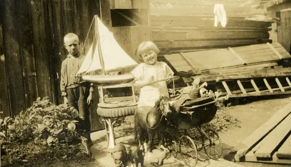 To barn med leker i gårdsrom på Enerhaugen, 4.juli 1924.