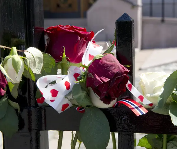Utenfor Stortinget. Blomster og kondolanser lagt ned i Oslo sentrum i forbindelse med ettårsdagen for terrorhandlingene i Oslo og på Utøya.
