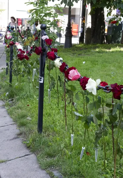 Bildet er del av en serie som følger opp fotodokumentasjonen som ble gjort av Norsk Folkemuseums fotograf, Anne-Lise Reinsfelt, i etterkant av terrorhandlingene i Oslo og på Utøya 22. juli 2011. Hennes bildeserie "Sorg i det offentlige rom" viser mangfoldet av blomster, lys, dikt, bilder, gjenstander og hilsener som folk la ut i Oslos gater. Dette bildet er tatt i forbindelse med ettårsmarkeringen for disse hendelsene.