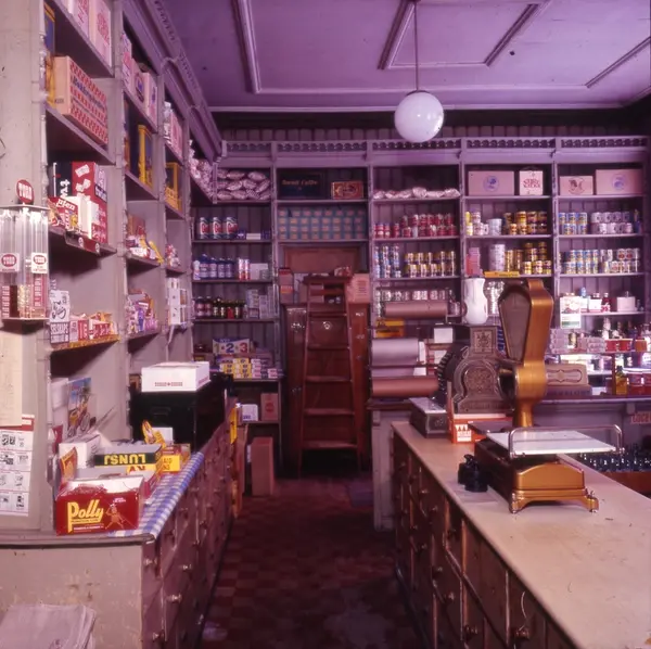 Butikkinteriør. Johan N. Nordlies kolonialforretning, Vibes gate 13, Oslo, fotografert i 1968 før ny eier overtok. Butikken ble innredet i ca. 1900, kjøpt av Nordlie i 1921 og solgt til Johan Skarpholt i 1968. Det meste av inventaret ble kjøpt av Norsk Folkemuseum i 1968.