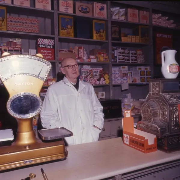 Kjøpmann Johan N. Nordlie bak disken i sin kolonialforretning, Vibes gate 13, Oslo. Fotografert i 1968 før ny eier overtok. Butikken ble innredet i ca. 1900, kjøpt av Nordlie i 1921 og solgt til Johan Skarpholt i 1968. Det meste av inventaret ble kjøpt av Norsk Folkemuseum i 1968.