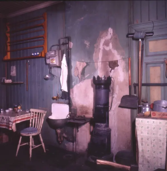 Lager/bakrom med spisekrok, ovn og utslagsvask. Johan N. Nordlies kolonialforretning, Vibes gate 13, Oslo, fotografert i 1968 før ny eier overtok. Butikken ble innredet i ca. 1900, kjøpt av Nordlie i 1921 og solgt til Johan Skarpholt i 1968. Det meste av inventaret ble kjøpt av Norsk Folkemuseum i 1968.