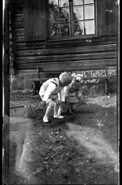 Julius Sundt leker med ukjent pike ved Villa Knyggen i Voksenlia, Oslo. Fotografert ca. 1920.