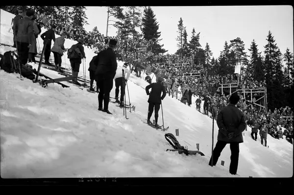 Holmenkollrenn i 1919. Publikum står og sitter langs bakken, noen på tribuner.