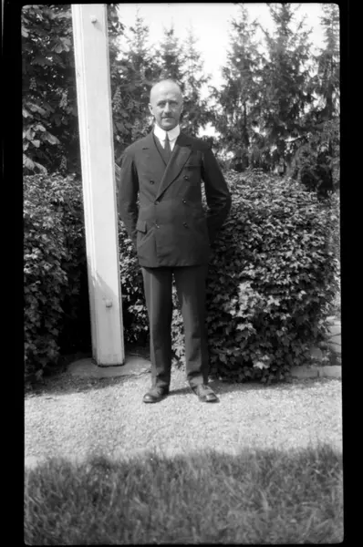 Rolf Sundt Sr. på sin 50-årsdag i hagen til broren Lauritz Sundt, på Bestum i Oslo. Fotografert 1931.