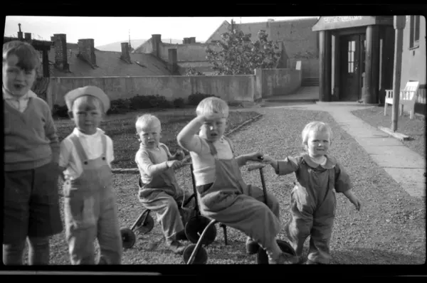 Lekekammerater på Heftyeterrassen, Oslo. Fra venstre Christian Butenschøn, Finn Aanesen, to brødre Thommesen og Lars Peter Sundt. Fotografert 1931.