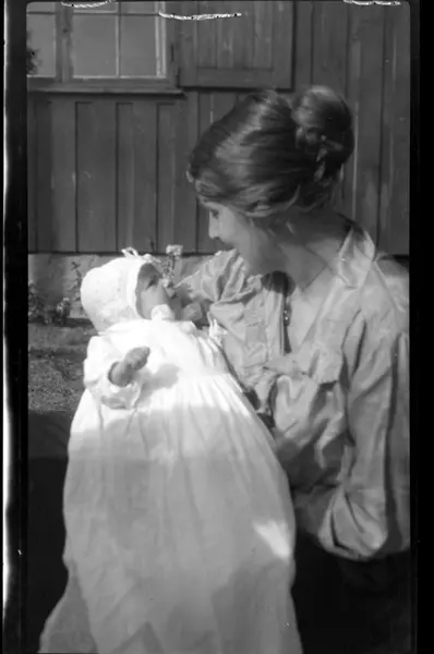 Hilda Sundt med sønnen Rolf Jr. i dåpskjole, utenfor Villa Knyggen i Voksenlia. Fotografert 18. september 1921.