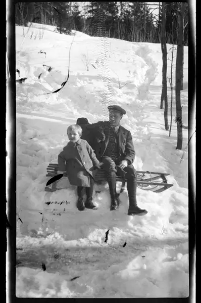 Rolf Sundt Sr. og sønnen Julius på kjelke i Voksenlia, Oslo. Fotografert rundt ca. 1920.