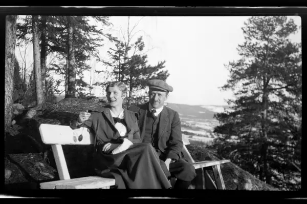 Ekteparet Hilda og Rolf Sundt sr. sitter på en benk på Villa Knyggen, Voksenlia. Fotografert 1919.
