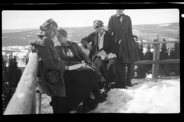 Hilda Sundt sitter som nr. to fra venstre sammen med ukjente kvinner, Villa Knyggen. Fotografert 1919.
