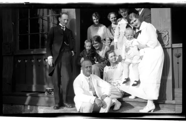15. juni 1919 er familien Aubert samlet på Villa Knyggen for å feire Hilda Thaulow Aubert Sundts 26-årsdag. (Øverst fra venstre) Einar Hansen, Birgit Aubert, Birgitte Aubert, Lilly Aubert, (rad 2 fra venstre) Betsy Aubert Hansen med Einar Aubert Hansen på fanget, Lillemor Aubert, fødselsdagsbarnet med Julius Sundt på kneet og (lengst frem) Rolf Sundt sr. på verandaen, Villa Knyggen. Fotografert 15. juni 1919.