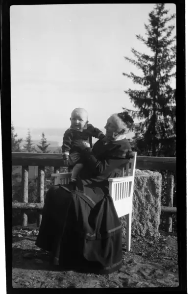 Julius Sundt sitter sammmen med sin oldemor Hilda Aubert på terrassen, Villa Knyggen. Fotografert ca. 1919.