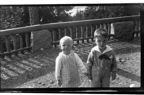 Julius Sundt og en ukjent gutt står på terrassen, Villa Knyggen. Fotografert 1919.