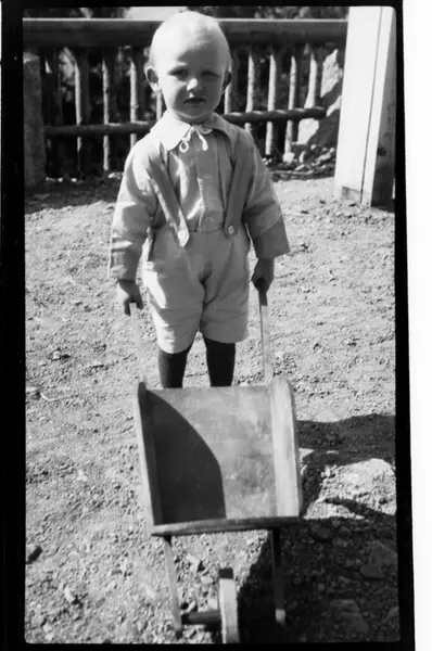Julius Sundt, ca. to år, med leketrillebår, Villa Knyggen. Fotografert 1919.