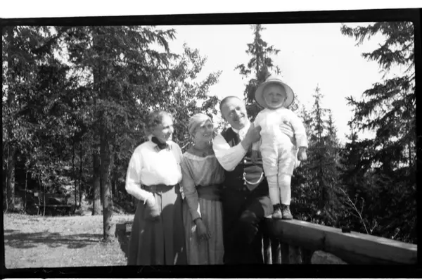 Birgitte Aubert og Julius Thaulow Aubert sammen med sin datter Hilda Sundt og hennes sønn Julius Sundt, ca. to år, Villa Knyggen. Villa Knyggen. Fotografert 1919.