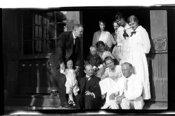 15. juni 1919 er familien Aubert samlet på Villa Knyggen for å feire Hilda Thaulow Aubert Sundts 26-årsdag. Julius Thaulow Aubert med Julius Sundt, Einar Hansen, Birgit Aubert, Betsy Aubert Hansen med Einar Aubert Hansen, Lillemor Aubert, Birgitte Aubert, Lilly Moestue, Rolf Sundt sr. og Hilda Sundt, Villa Knyggen. Fotografert 15. juni 1919.